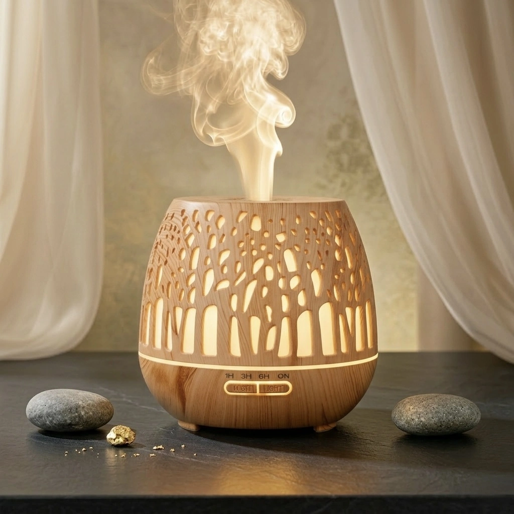Stwórz w swoim domu przestrzeń pełną relaksu i harmonii. Nasz kominek zapachowy wykorzystuje nowoczesną technologię ultradźwiękową, która delikatnie rozprasza aromat w postaci chłodnej mgiełki, jednocześnie nawilżając i oczyszczając powietrze.